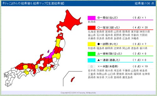 chihiroさんの記事を読んで、これは楽しそう!と作ってみました♪ 住んだことがある、泊まったことがある、などの項目で、その都道府県をどの程度、経験したのか。あ、「経県」したのか!を数値で表せるんです^^ 経県値 さっそくわたしの経県値をば。 (貼り…